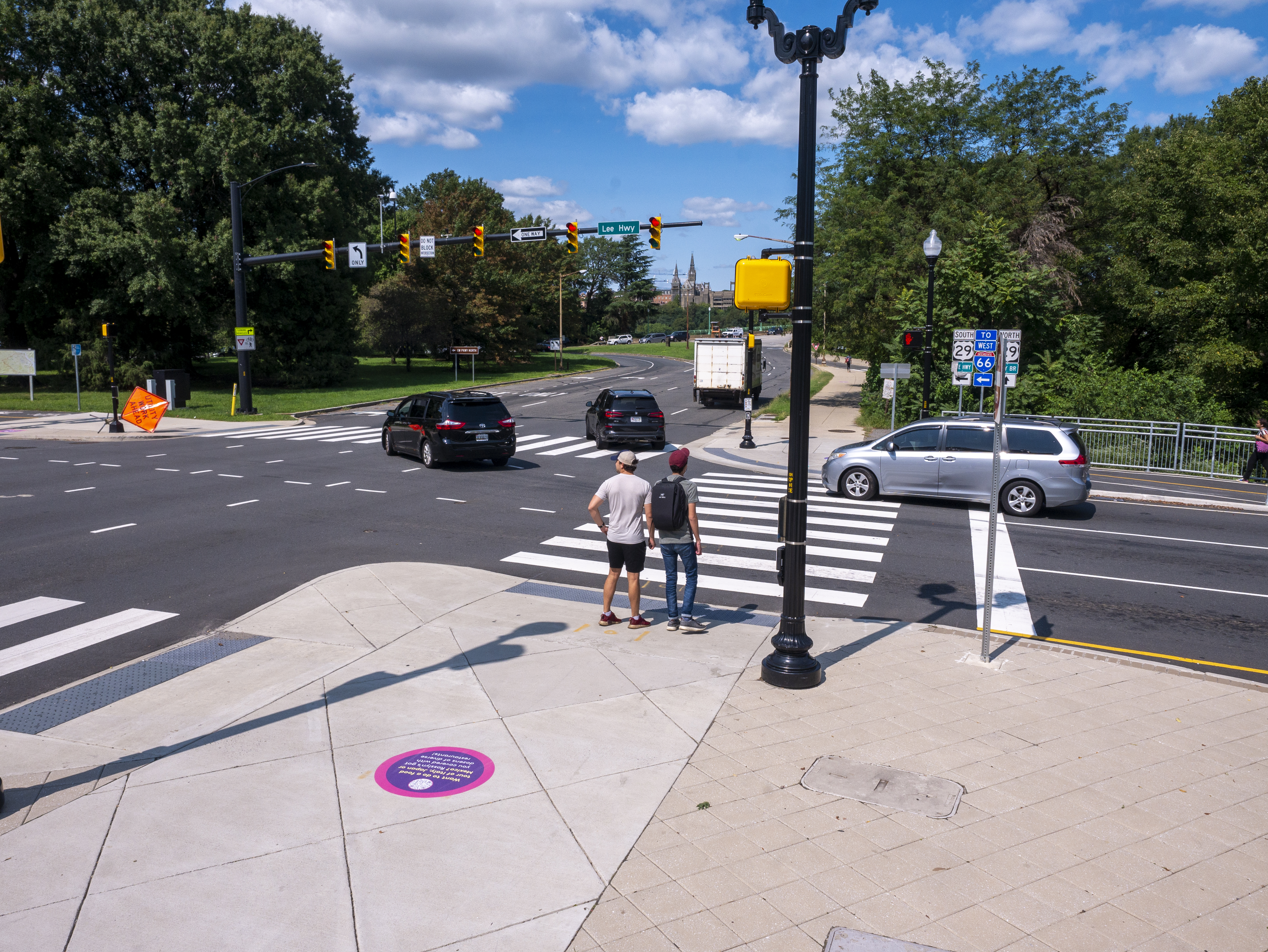 Two pedestrians wait at a high visibility crosswalk near a highway interchange.
